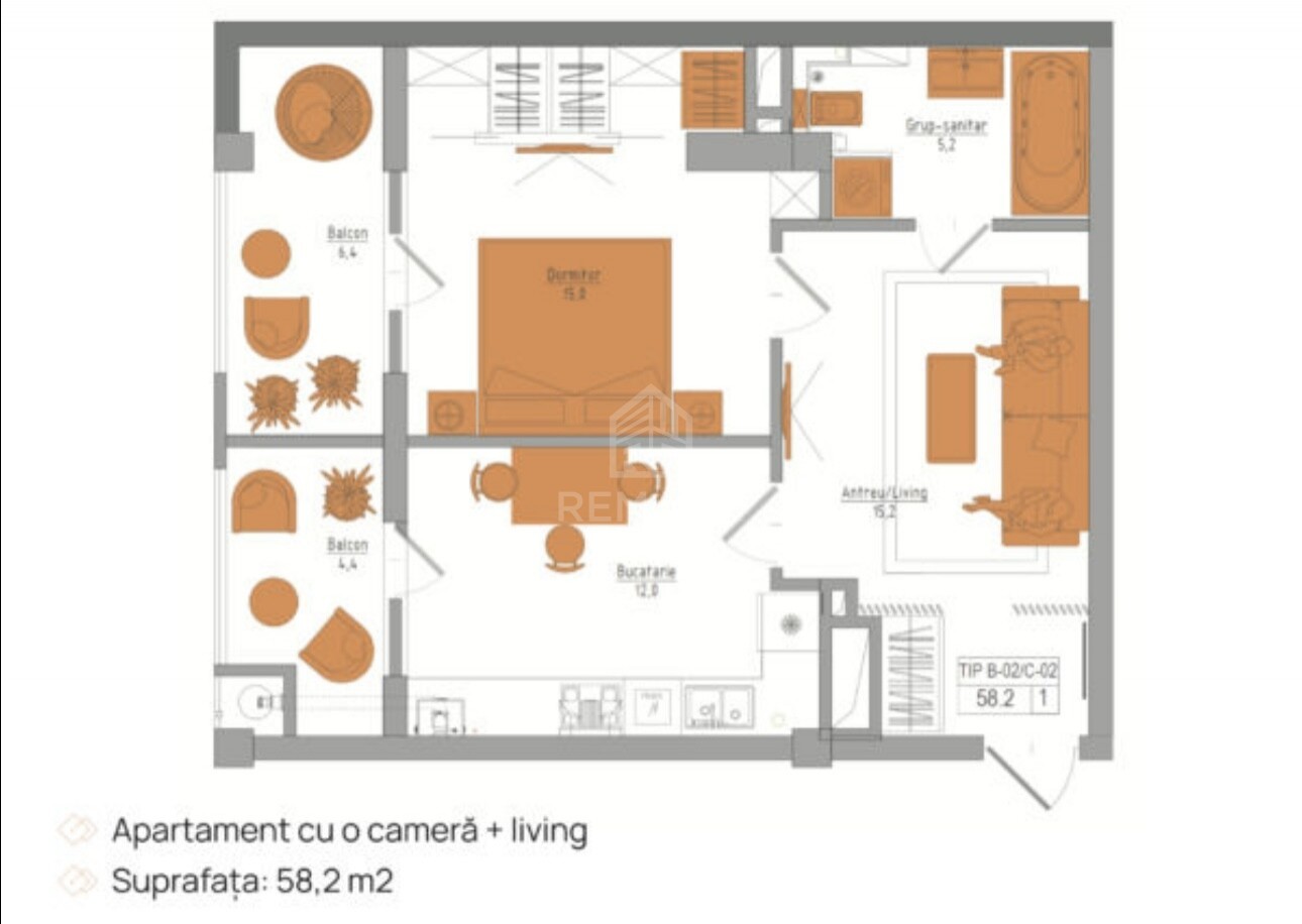 Apartamentul are 59 mp. cu 2 camere, compartimentat în dormitor, bucătărie comasată cu living, antreu, bloc sanitar și 2 balcoane.