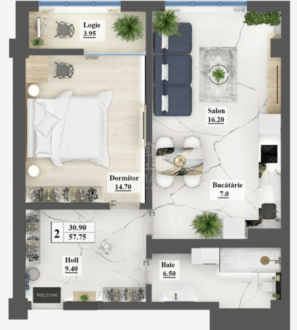 - Suprafață totală de 58 mp