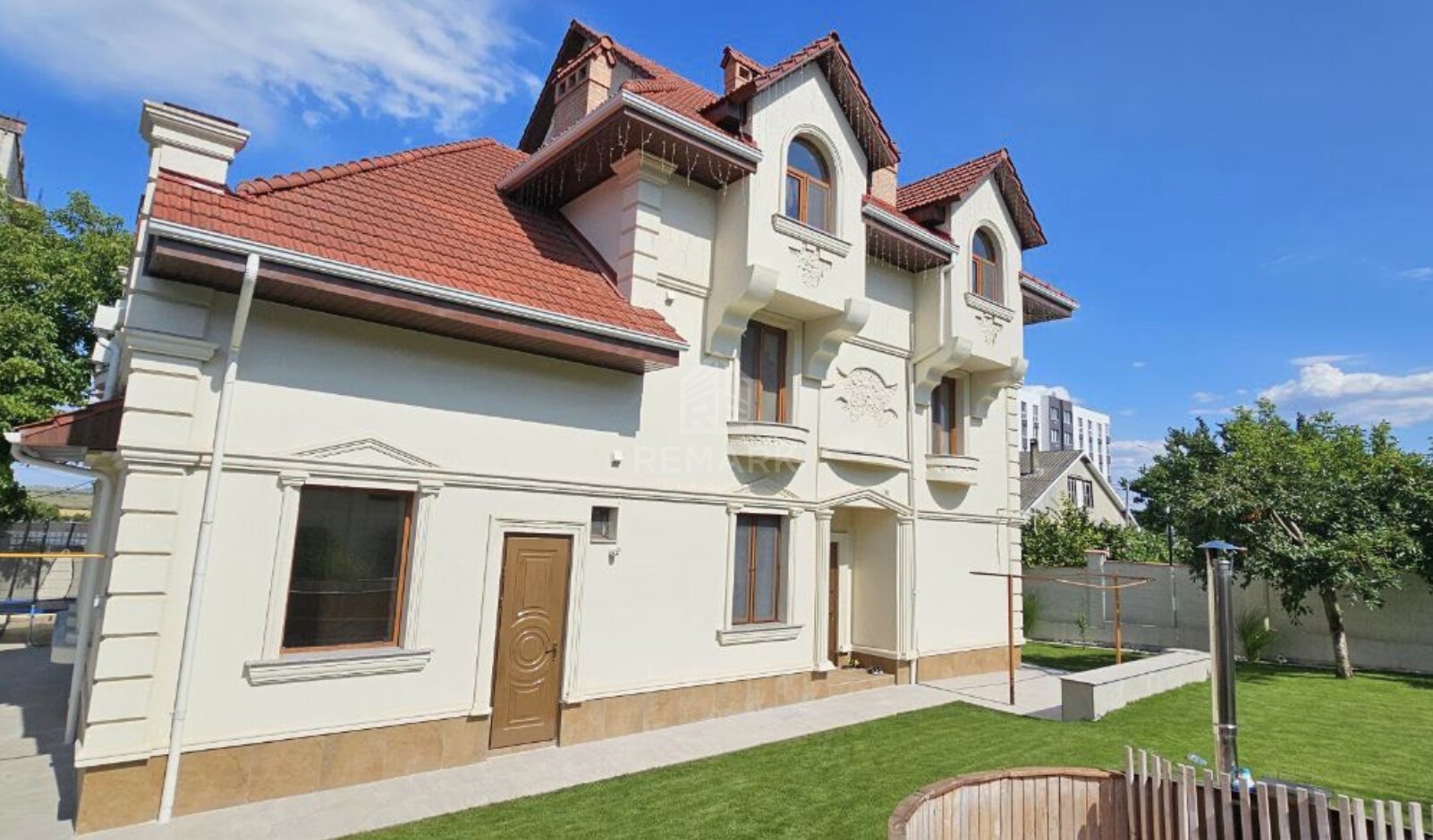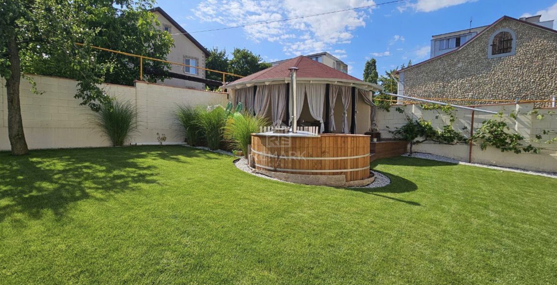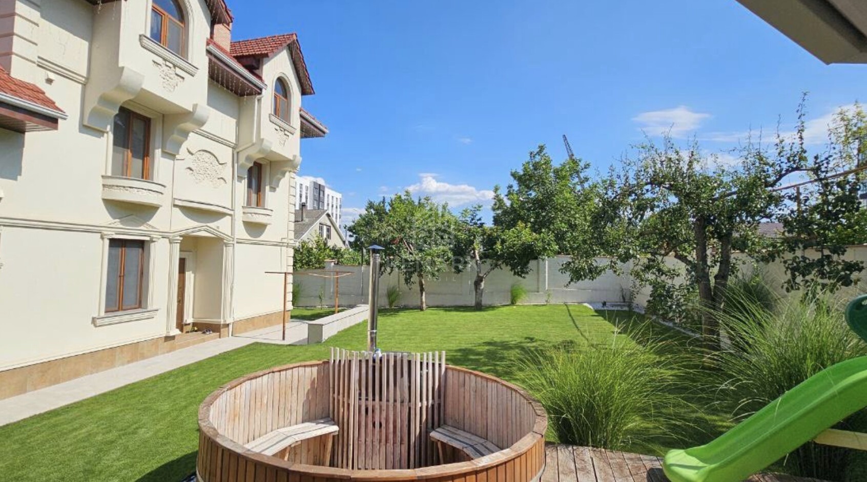 - Curte amenajată complet: gazon, plantații decorative, sistem automat de irigare