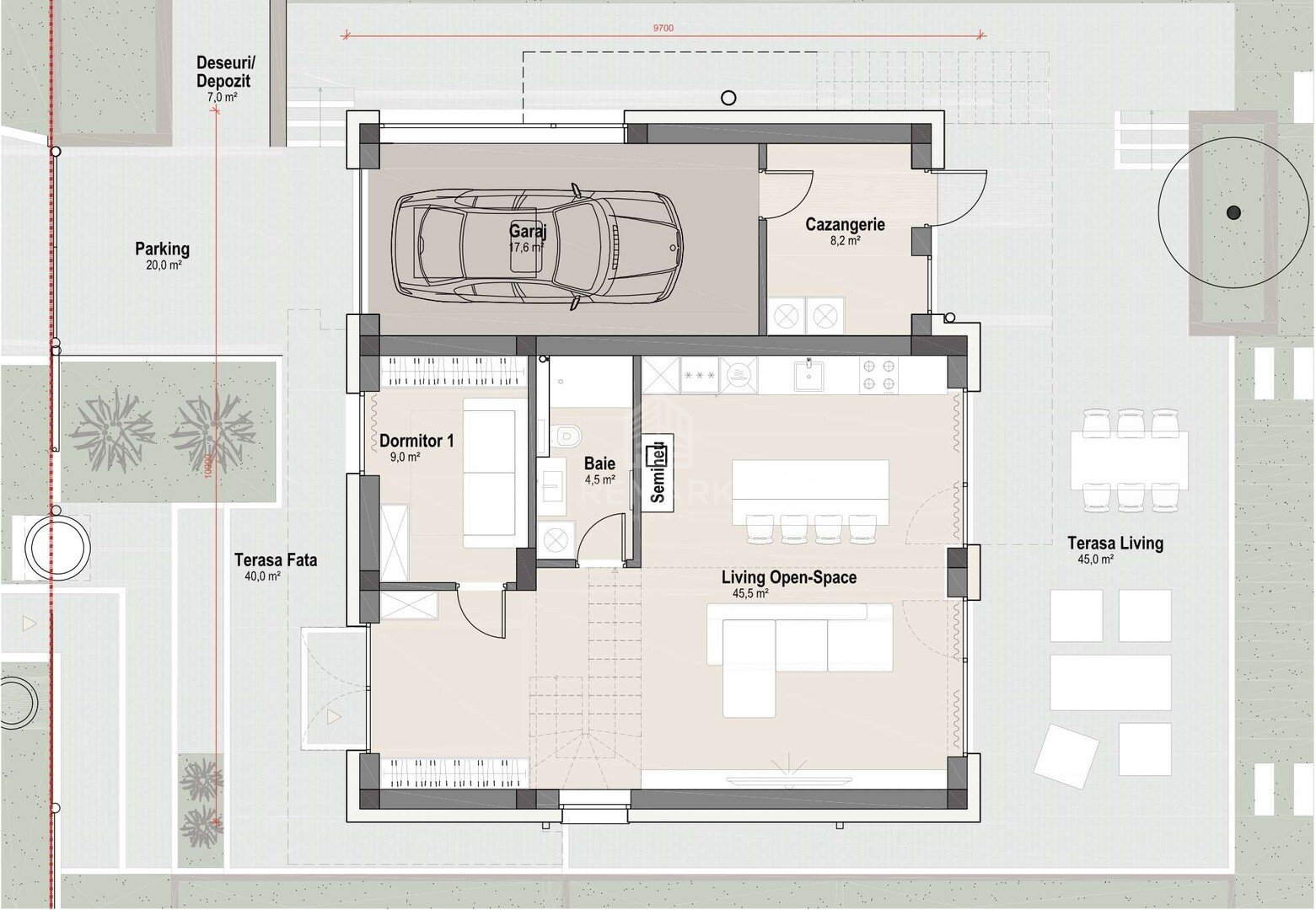 - Первый этаж: гостиная open-space, объединённая с кухней, спальня, санузел, котельная