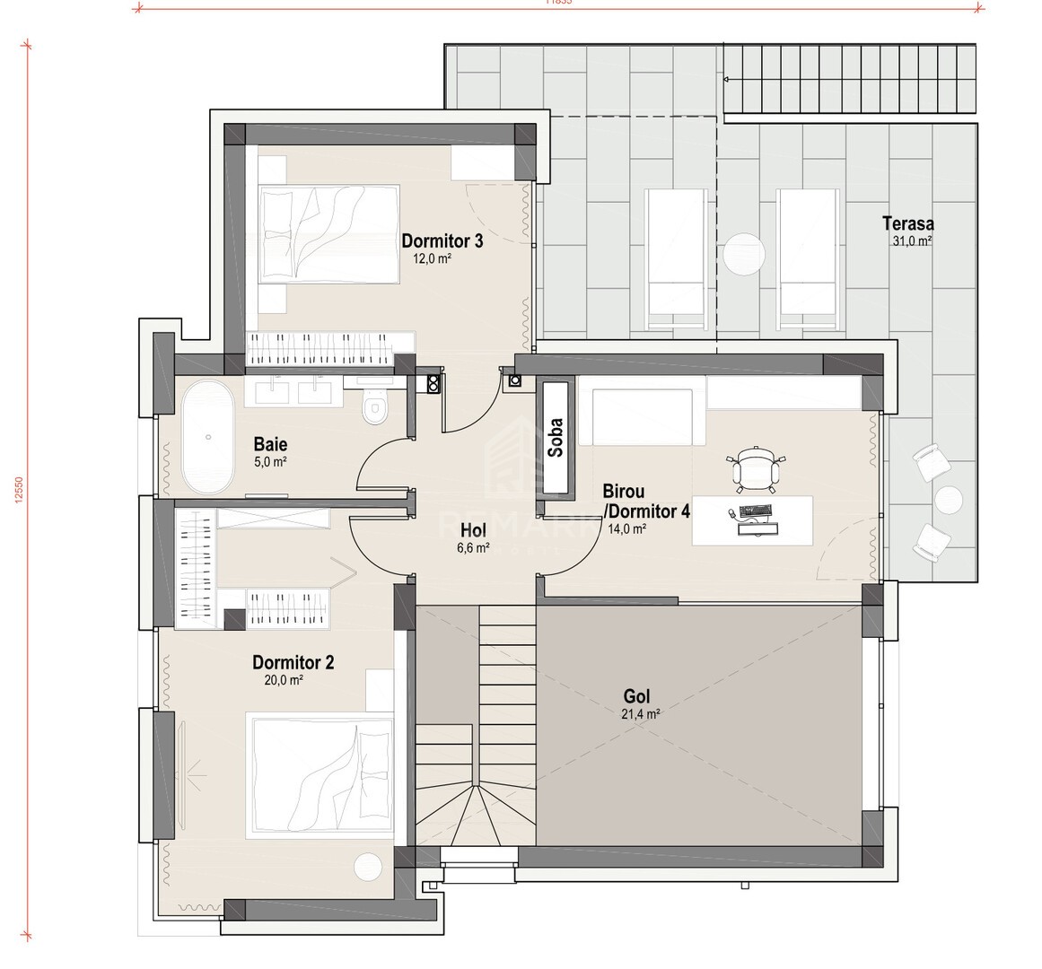 - Второй этаж: 3 спальни/кабинет, санузел, панорамная терраса