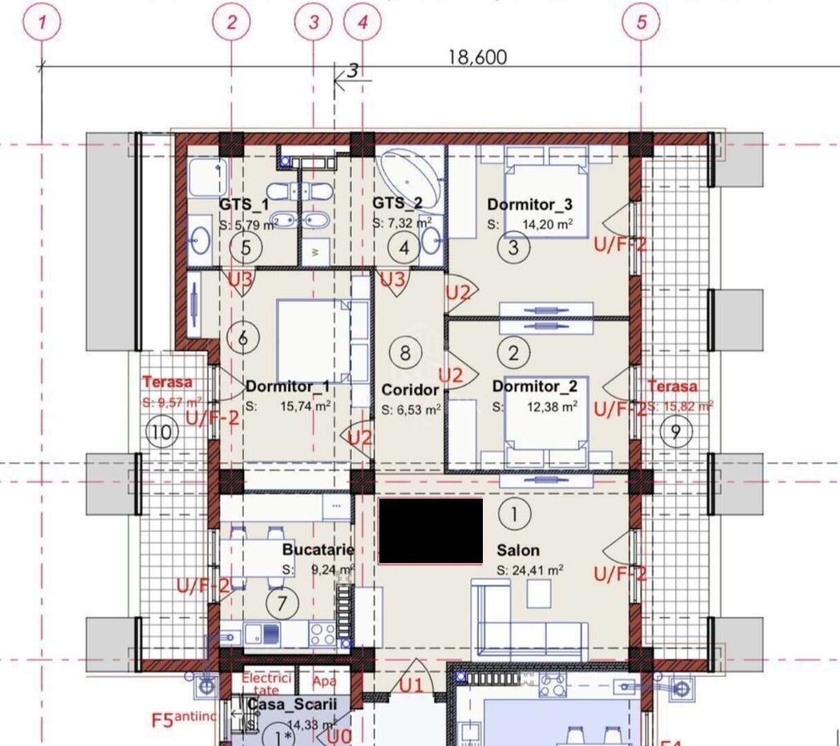 — 4 комнаты, включая 3 спальни, просторная гостиная, отдельная кухня, 2 ванные комнаты, прихожая, 2 террасы.